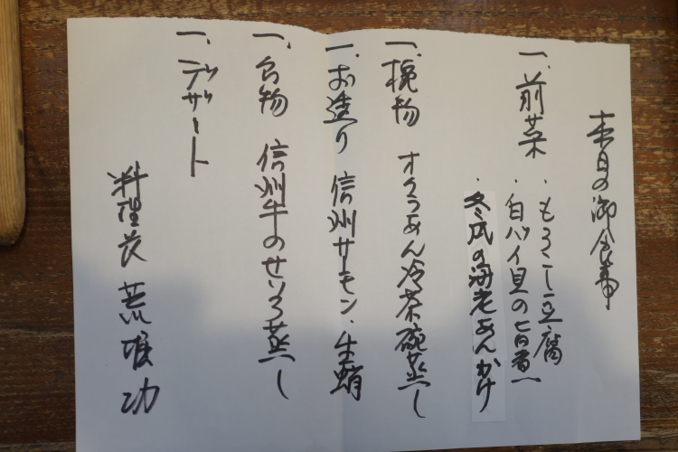 この店のメニューは こんな感じ 。 「せいろ蒸し」 が基本なんっすが、うどんを蒸すか、ウナギを蒸すか、地鶏を蒸すか、黒豚を蒸すか、信州牛を蒸すか、ムスカ を蒸すか。 信州牛を蒸す場合、門前せいろ蒸し 2,970円(税込)が基本。 それに生麩と海老が追加されたり、信州牛が100gから150gに増量されたり、ただの信州牛が霜降りの特上信州牛になったりすることによって、お値段もお高くなるんっすが、個人的には信州牛が増量された「山のせいろ蒸し」 3,850円(税込)が、いいな♪ …と。 ご予約のページ には 「メニューは当日お店で」 という選択肢のほか、「ご会食おまかせ」 のコースが 3,300円〜5,500円まで5種類。