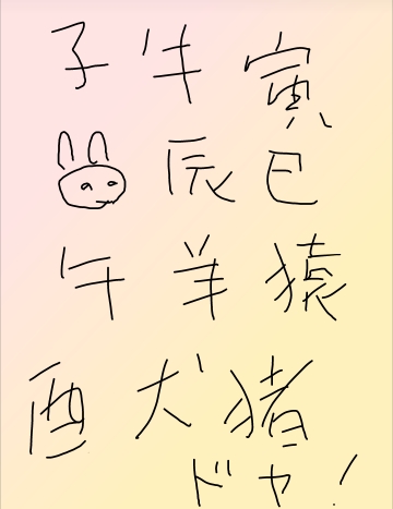まず最初は「ね」。 ネズミっすよね。 が、「鼠」という漢字ではありません。 もし 「鼠」 という漢字だったりしたら、絶対に書けないんっすが、十二支の「ね」は、アレっすよね。 「こども」という字? で、次。「うし」。 これは書けます。 例のウシっすよね? で、「とら」 。 これはアレっす。 猛虎とかのほうではなく、岐阜の輪之内にある「とらちゃんラーメン」のほうの「とら」。 書けるかどうかは微妙なんっすが、漢字のイメージは浮かんでます。 「う」。 ううぅ…。 これはまったく、見当もつかん…。 ウサギなんでしょうが、普通のウサギでよかったんっすかね? で、「たつ」。 竜や龍ではなく、観光地で見かける漬け物屋のほうの「たつ」だったと思います。 「み」。 蛇っすな。 何か、あんな感じの漢字っすよね? で、「うま」。 これはアレっす。 馬ではなく、「うし」 の突き抜けてないバージョンみたいなの。 「ひつじ」。 ヒゲ生やして、メェメェ鳴いてる奴ではないっすよね。 あれはヤギ。 じゃ、ヒツジは何て鳴くのかというと、ヒィツジィ、ヒィツジィ。 by いとしこいし 。 で、「さる」。 これは分かります。 「とり」 。 これはアレっすよね。 鳥でも鶏でもなく、なんか 「にし」 っぽい奴。 頭の中にイメージは浮かんでます。 で、「いぬ」。 これは余裕。 「い」。 イノシシっすな。 で、最後に「どや」。 あ、これは答えなくていいっすか。 こうしてみると、100点は無理としても、意外とイケそうっすな。 では、解答をどうぞ。